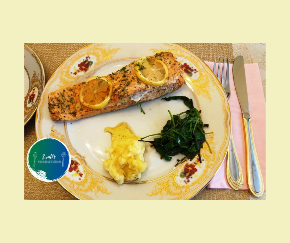 Take an Aluminium foil, put the marinated Salman & Bake it on 200 degrees Celsius for 25 mins & it’s ready to serve.